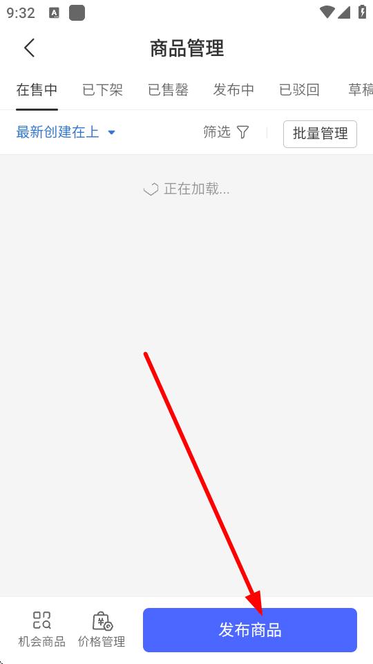 3、进入商品管理页面后,点击下方的发布商品按钮。