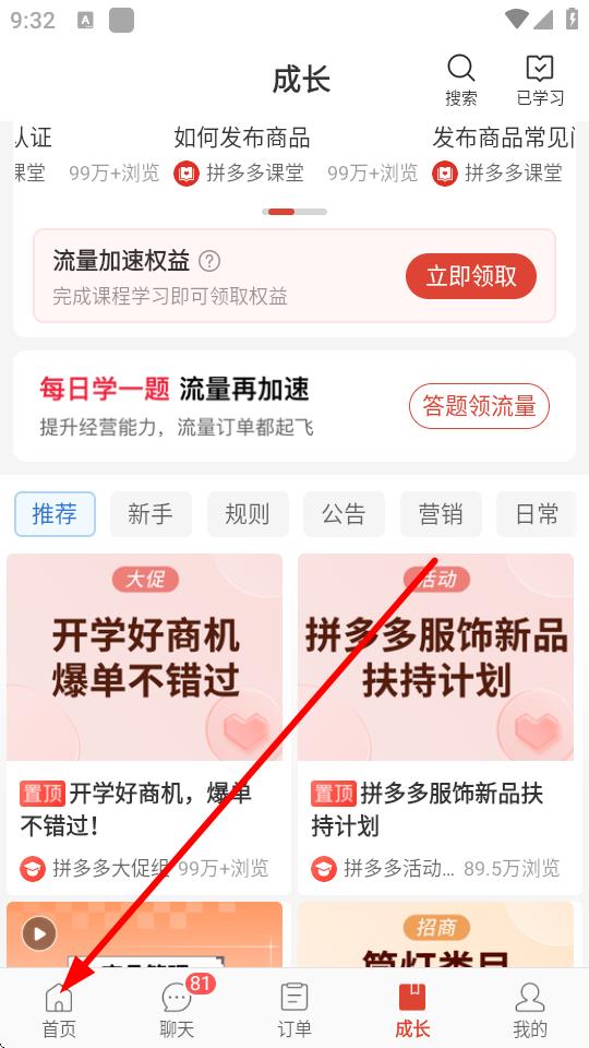 1、打开拼多多商家版APP,点击底部导航栏中的首页选项进入首页界面。