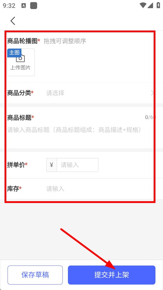 4、按照页面提示依次上传商品轮播图、选择商品分类、填写商品标题、拼单价、库存等信息,确认信息无误后点击提交并上架,即可完成商品发布操作。