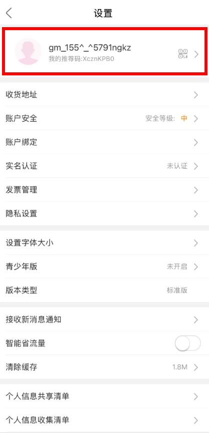 3、进入设置页面后,点击头像及用户名区域,进入个人信息页面。