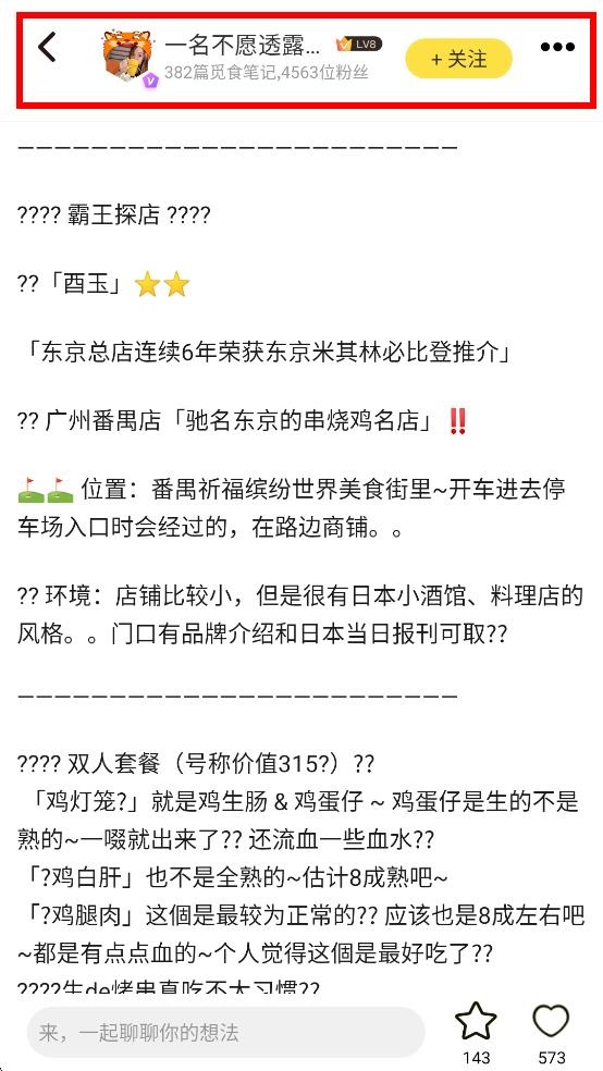 4、点击该探店内容后,可查看详细的探店报告,还能看到发布者信息,可选择关注。