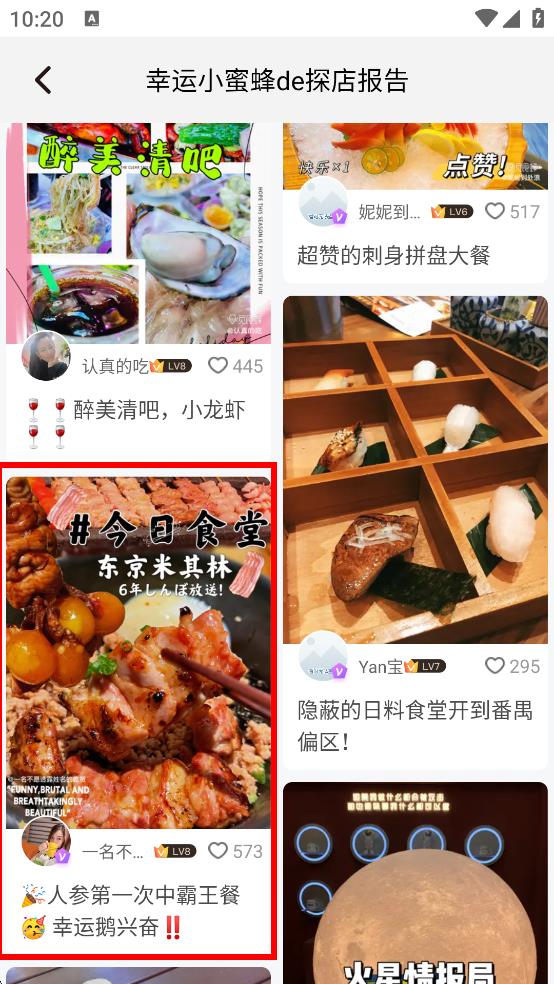3、在幸运小蜜蜂de探店报告页面,选择感兴趣的探店内容。