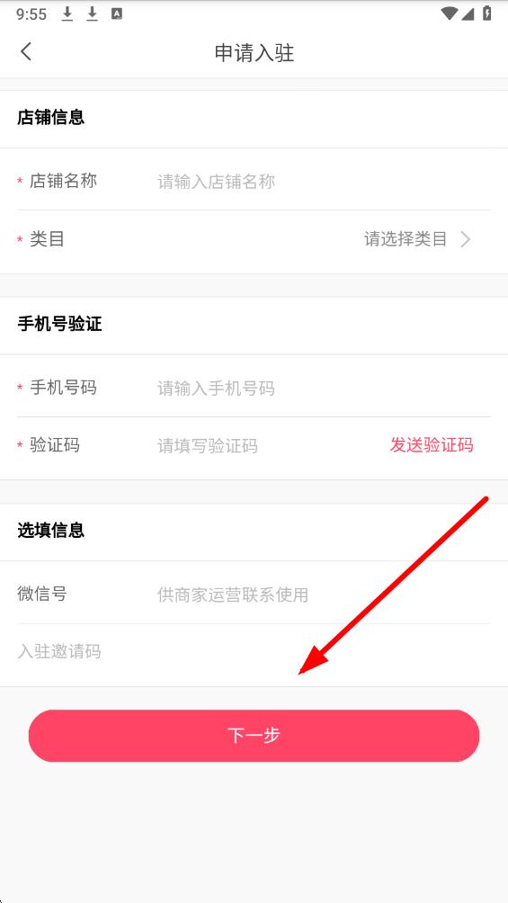 3、在申请入驻页面,依次填写店铺信息,全部填好后点击下一步,按后续指引完成开店操作。
