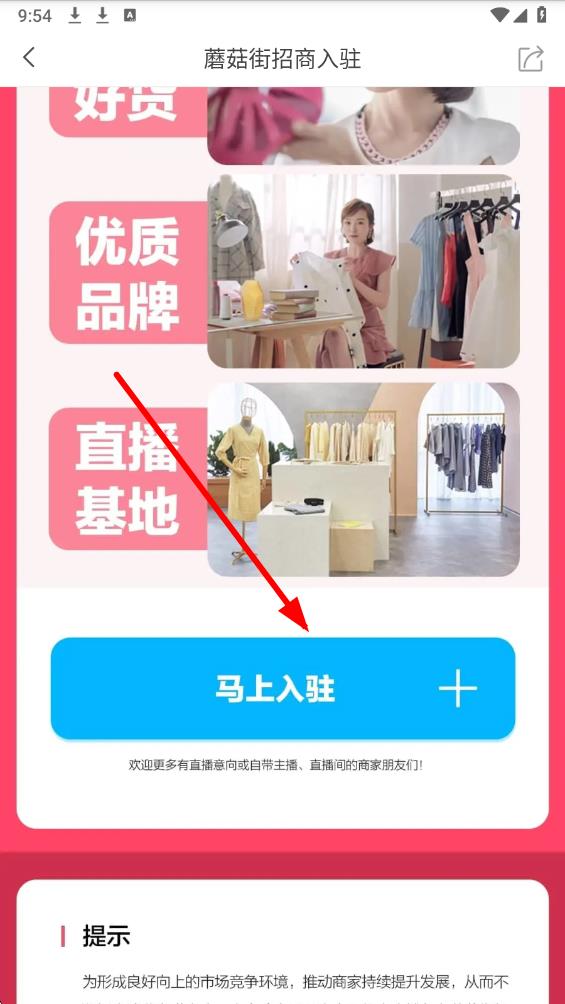 2、进入蘑菇街招商入驻页面后,了解平台优势,确认入驻意向后,点击马上入驻按钮,进入申请流程。