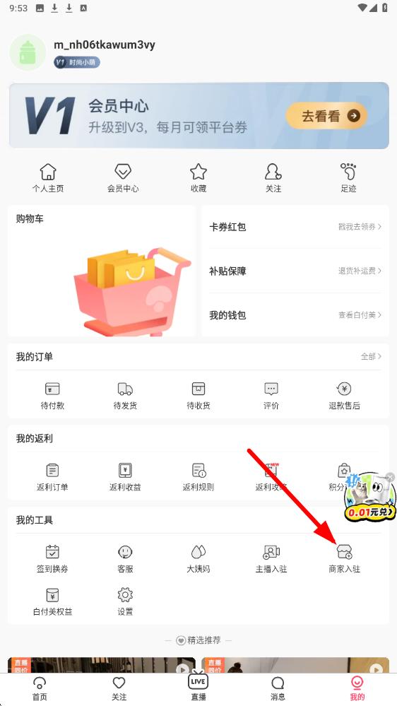 1、打开蘑菇街APP并登录账号,点击底部导航栏的我的,找到商家入驻选项并点击,即可进入蘑菇街招商入驻相关页面。