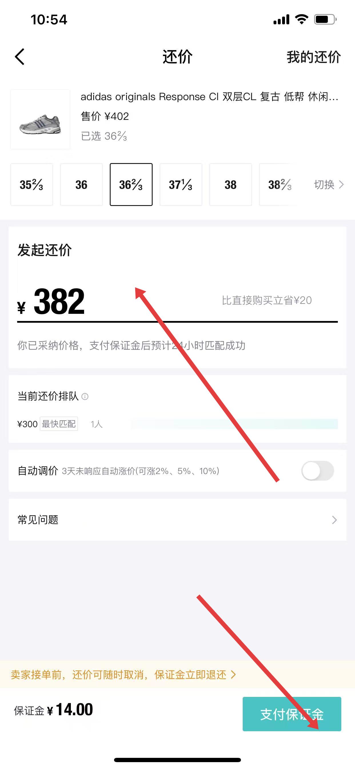 3、进入还价页面后,选择商品尺码,在发起还价处输入你期望的价格,点击支付保证金。