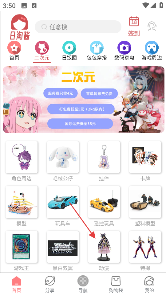 2、在二次元商品页面,点击动漫分类,进入动漫手办列表。