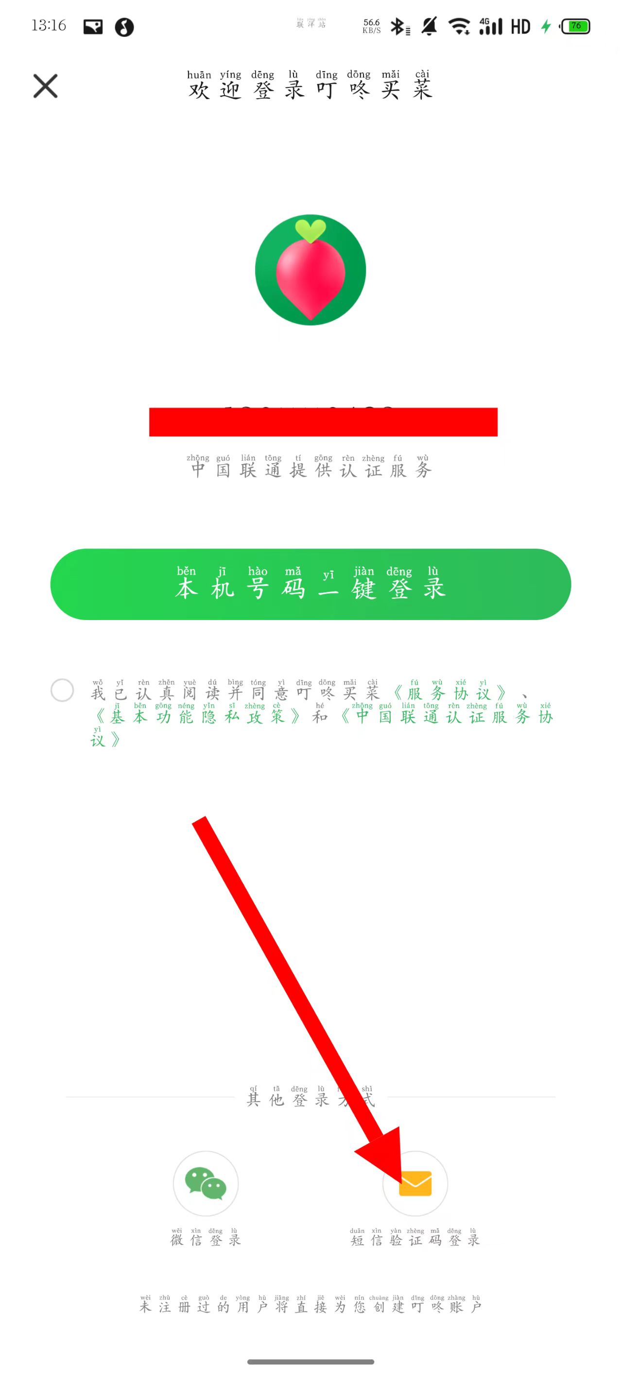 3、在登录页面,点击短信验证码登录选项,进入短信验证码登录页面。