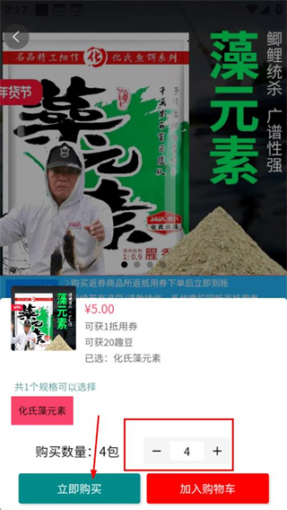 3、在商品详情页面,点击立即购买按钮,进入购买数量选择页面。