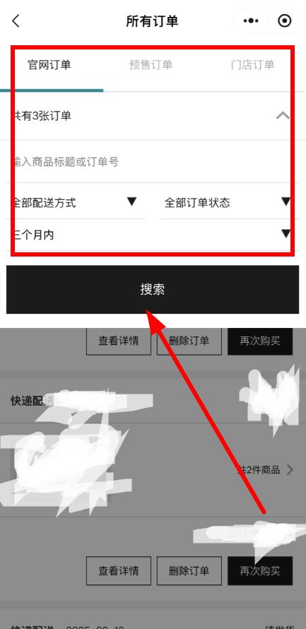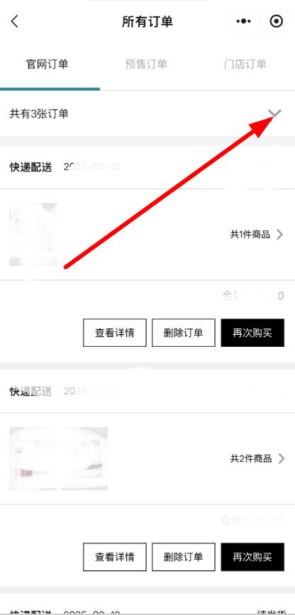 3、在所有订单界面,可直接浏览近期订单,需搜索特定订单,点击订单列表上方箭头展开搜索栏。