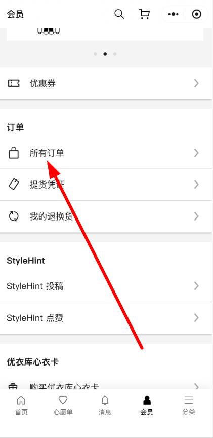 2、在会员页面,点击所有订单选项,进入订单查看界面。