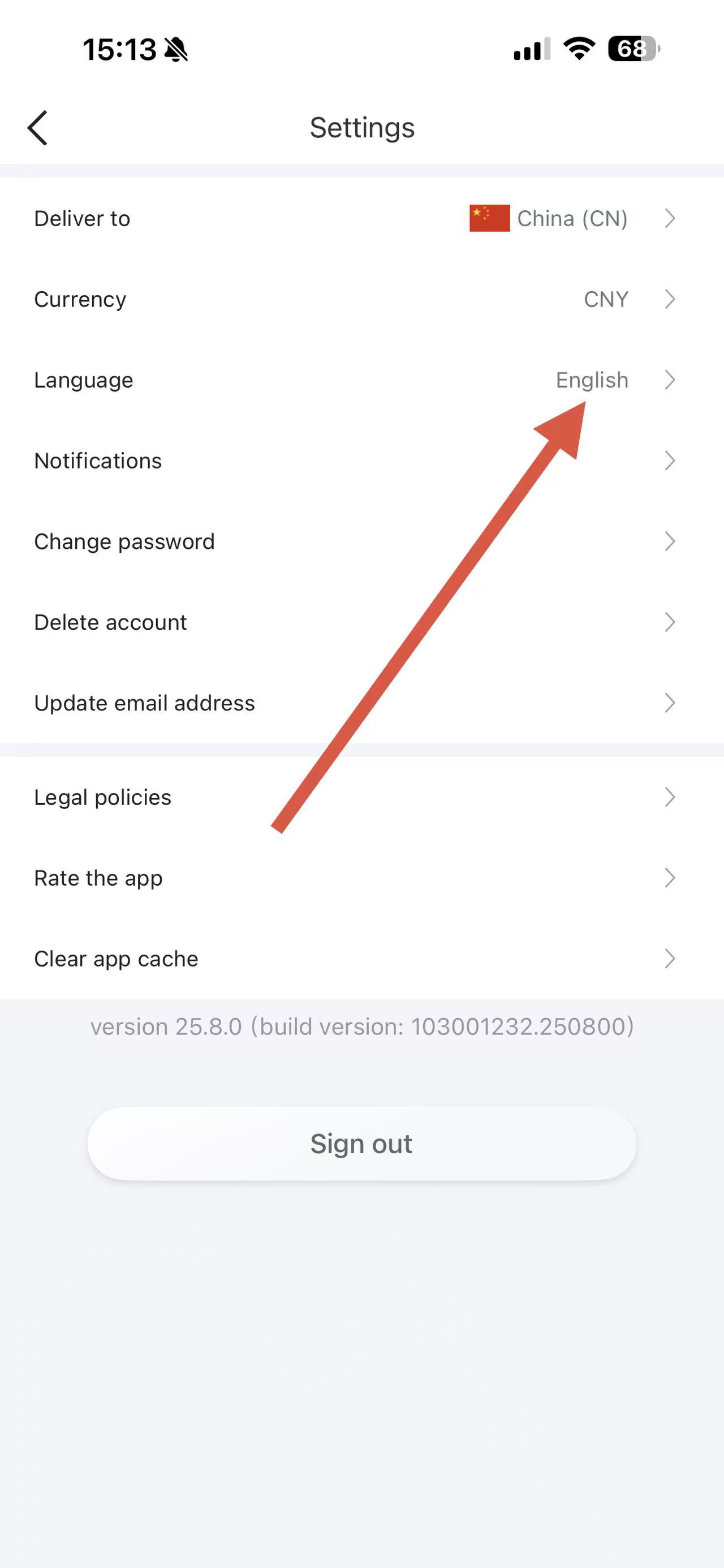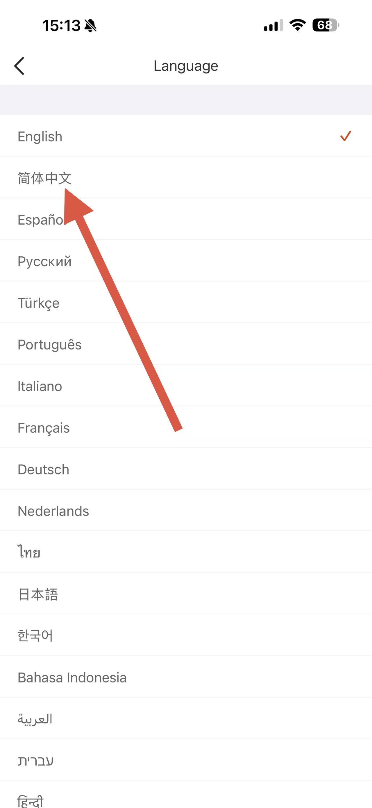 4、在Language语言选择页面,找到并点击简体中文,即可将APP设置为中文版。