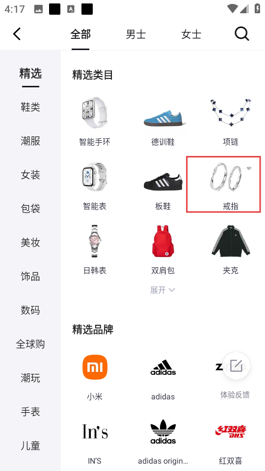 2、在分类页面,找到并点击戒指选项,进入戒指商品列表。