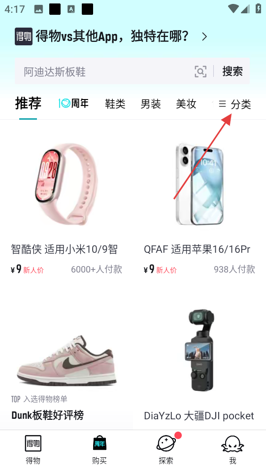1、进入得物APP,点击页面上方分类按钮,展开分类选项。