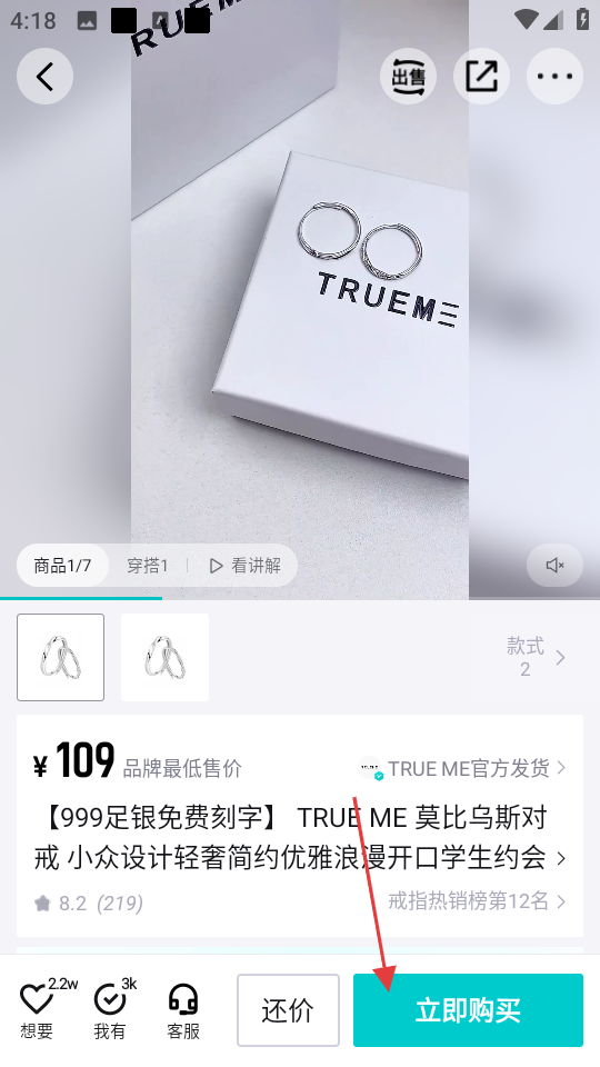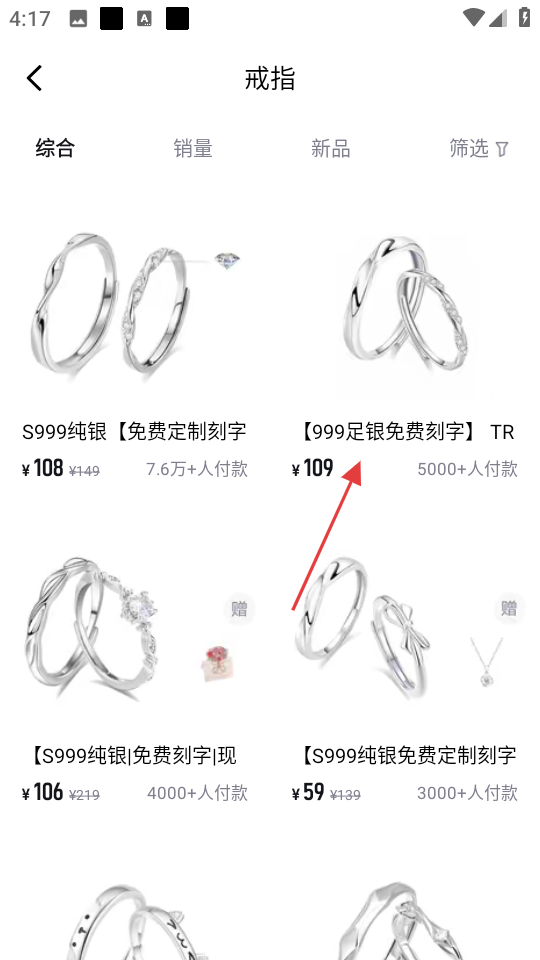 3、在戒指商品列表中,挑选心仪的戒指,比如价格为109的这款,点击进入商品详情页。