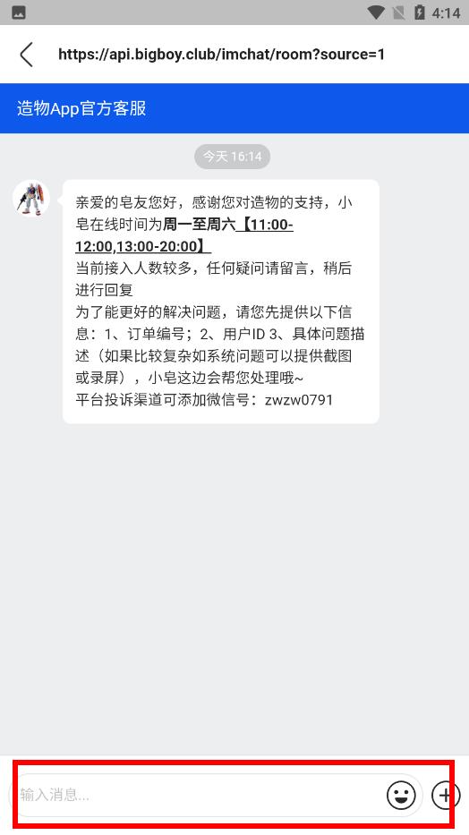 3、进入客服聊天界面后,在底部输入框内,输入你遇到的问题,点击发送等待回复即可。