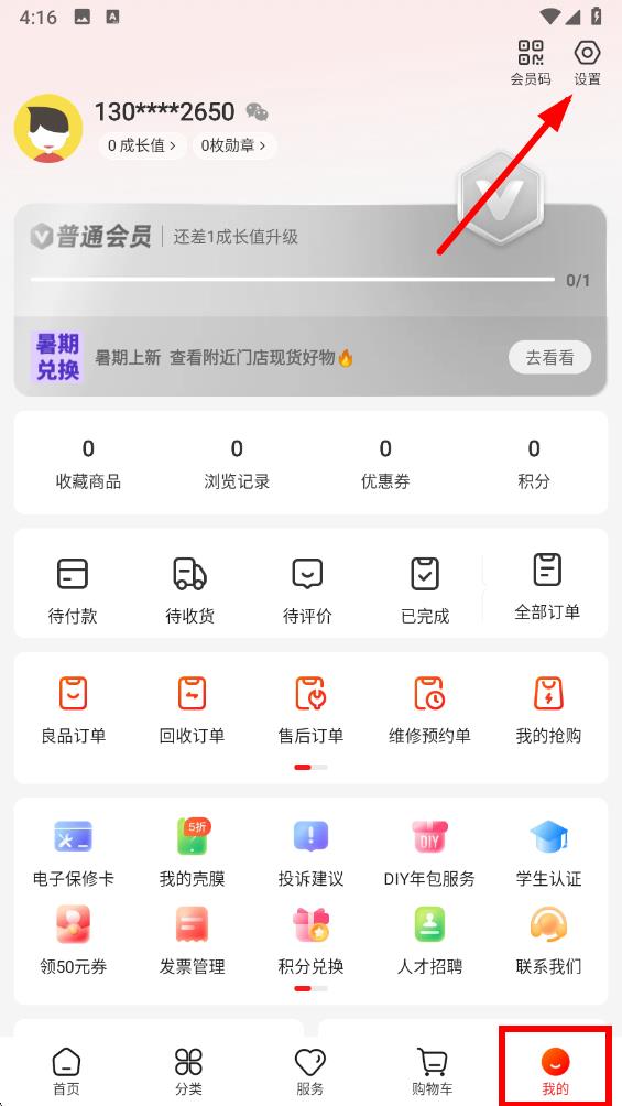 1、打开九机网app,点击底部导航栏中的我的选项,点击页面右上角的设置图标进入设置界面。