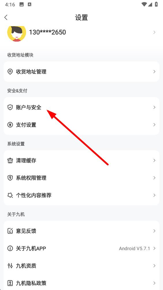 2、在设置界面中找到账户与安全选项并点击进入。