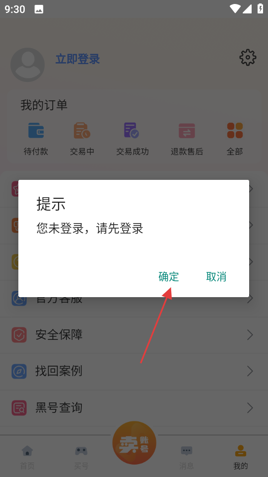 2、若未登录,在弹出的提示框中点击确定,进入用户登录页面。