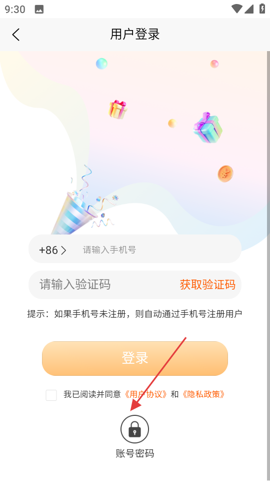 3、在用户登录页面,点击账号密码,切换到账号密码登录界面。