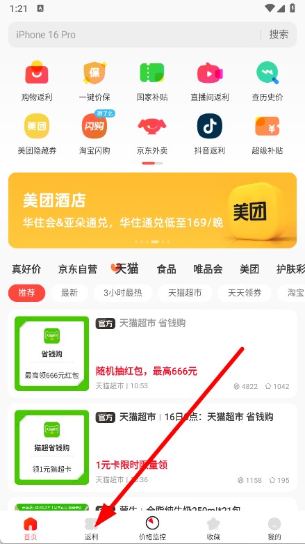 1、打开省钱快报APP,点击底部返利选项,进入返利页面。