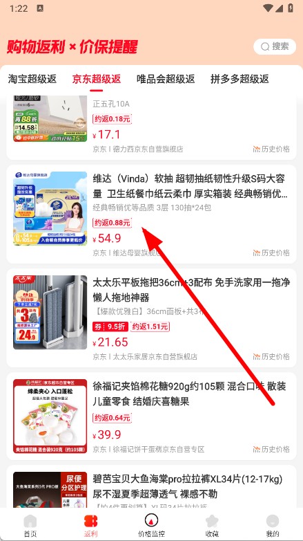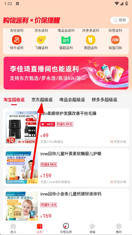 2、在返利页面,点击京东超级返分类,进入京东超级返商品列表页。