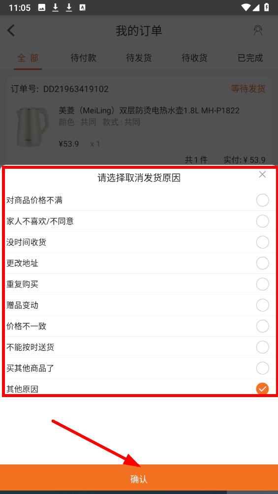 3、点击取消发货后,会弹出取消发货原因的窗口,里面有多个选项,按需勾选原因后,点击窗口下方的确认按钮,即可尝试取消订单。