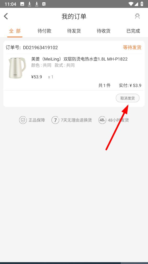 2、在我的订单页面找到想要取消的订单,点击该订单右侧的取消发货按钮,进入取消订单操作流程。