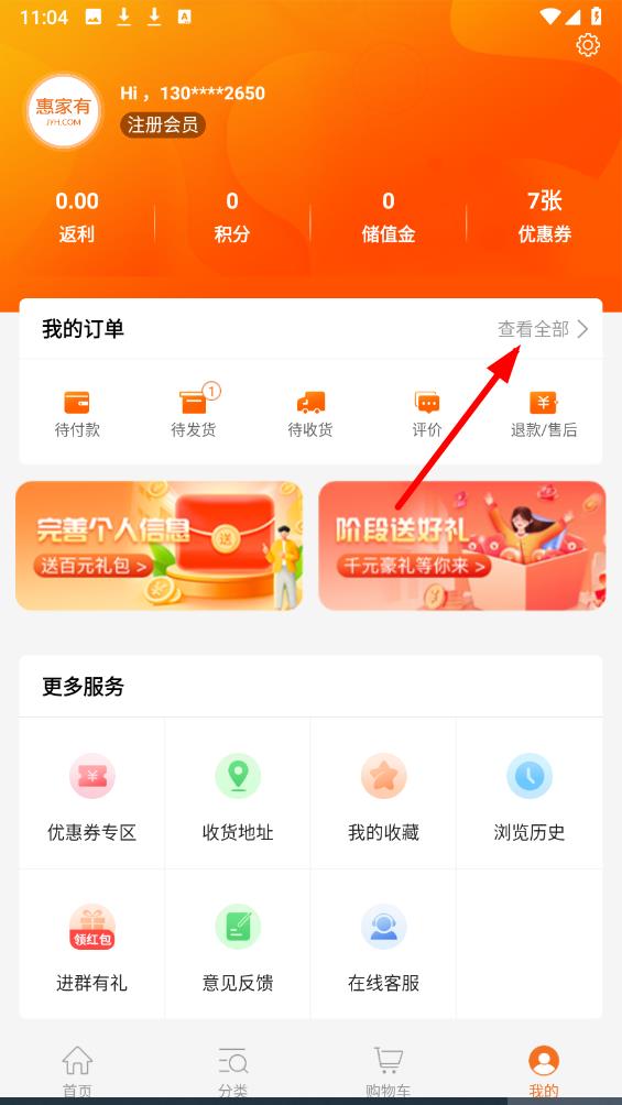 1、打开惠家有购物APP,点击底部导航栏中的我的,进入个人中心页面,点击我的订单查看全部。