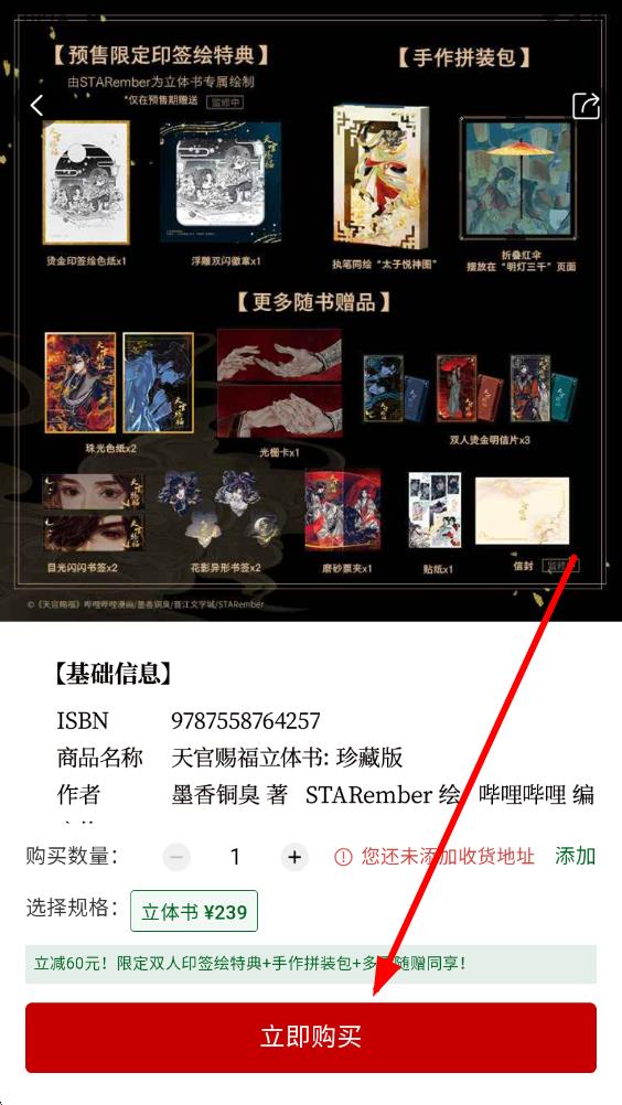 2、进入书籍详情页面,查看书籍介绍、随书赠品等信息,确认规格和购买数量后,点击立即购买按钮。