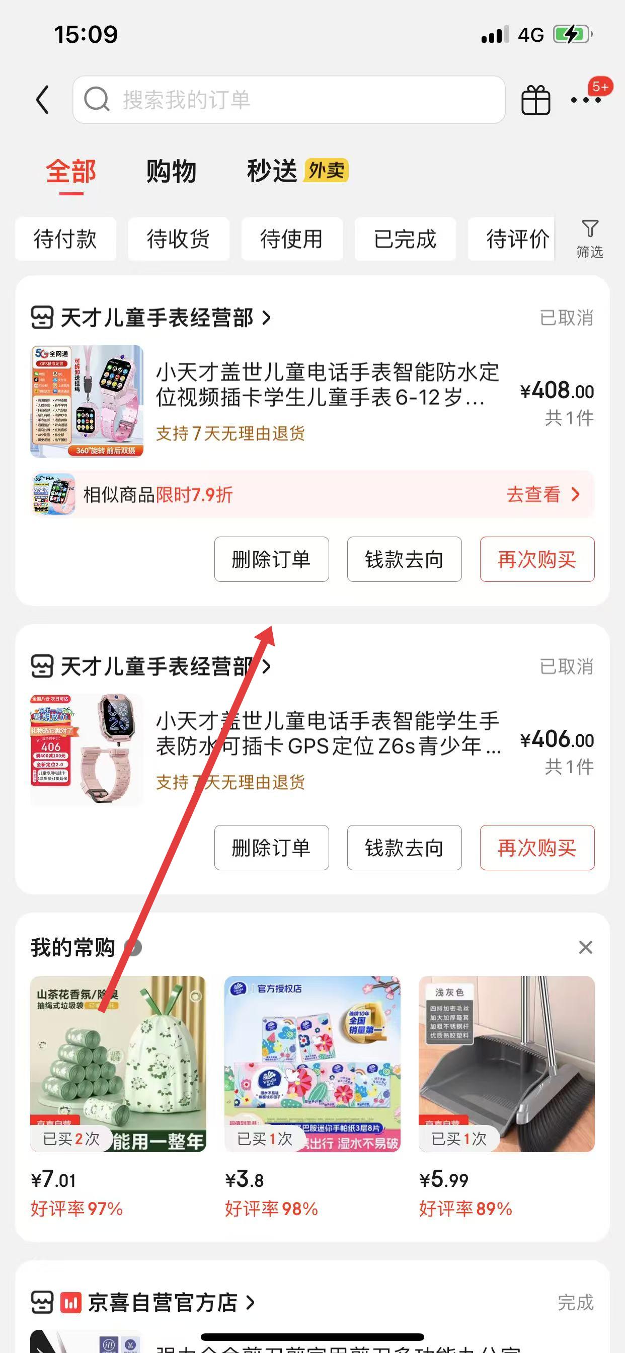 2、在订单列表页面,找到想要删除的订单,点击该订单下方的删除订单按钮。