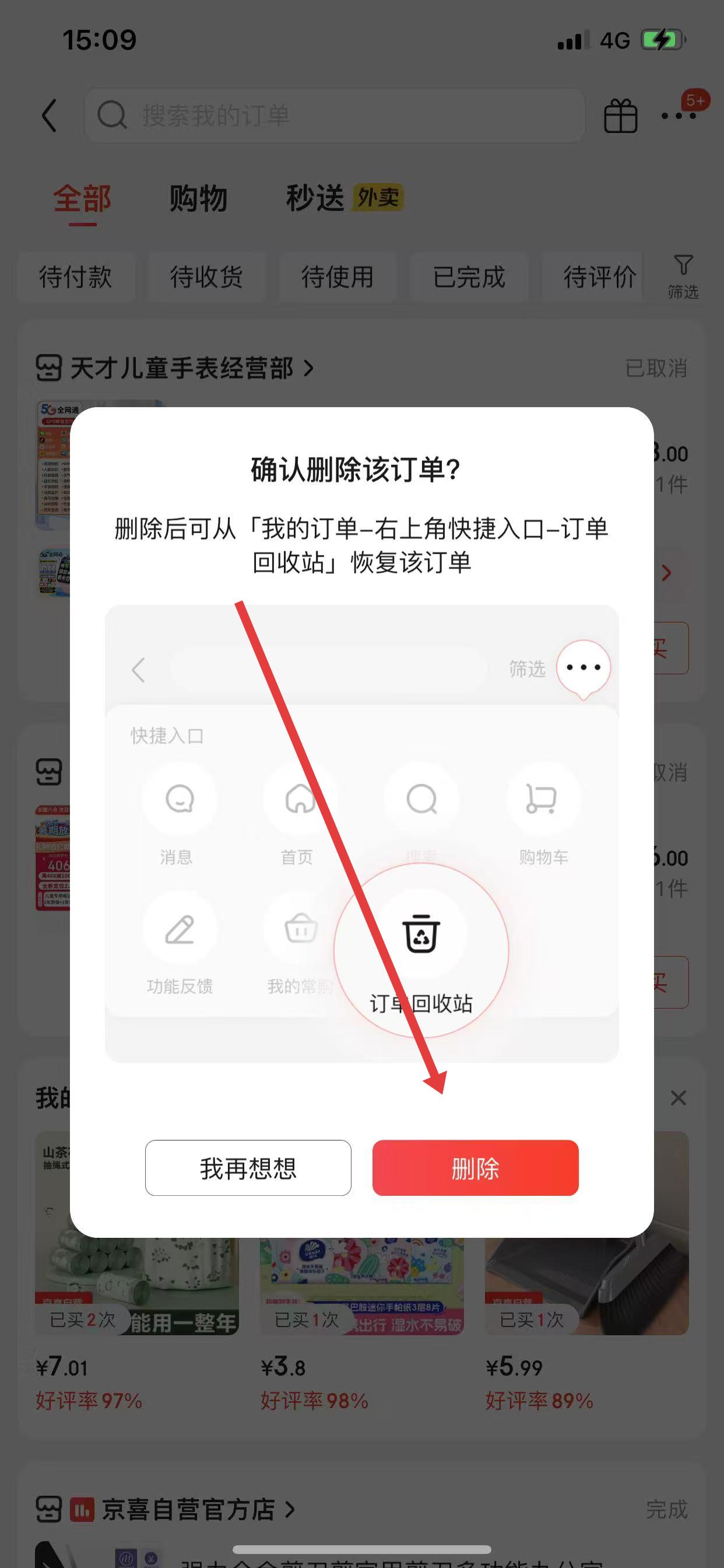 3、此时会弹出确认删除的提示框,点击删除按钮,即可将该订单从订单列表中删除。