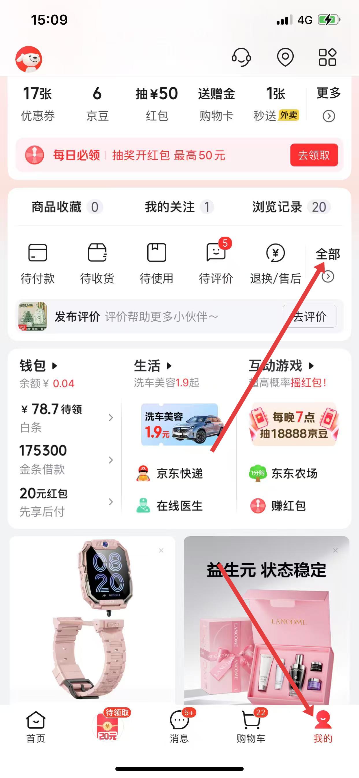 1、打开京东APP,点击底部导航栏中的我的,找到并点击全部,进入订单列表页面。