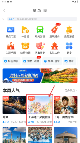 3、在景点门票页面,找到上海迪士尼度假区条目,点击进入详情页。
