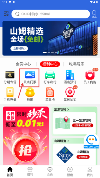 2、在福利中心页面,点击景点门票选项,进入门票预订界面。