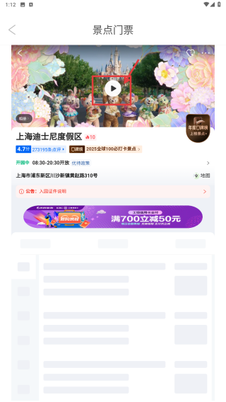 4、在上海迪士尼度假区详情页,点击播放按钮,查看景区相关信息。