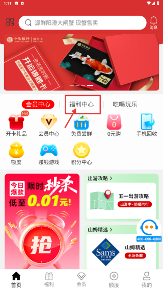 1、打开综合服务应用,点击福利中心选项,进入福利功能页面。