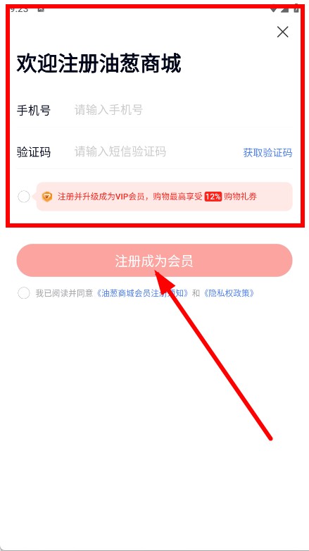 4、输入手机号、验证码,勾选同意相关协议后,点击注册成为会员按钮,即可完成注册。