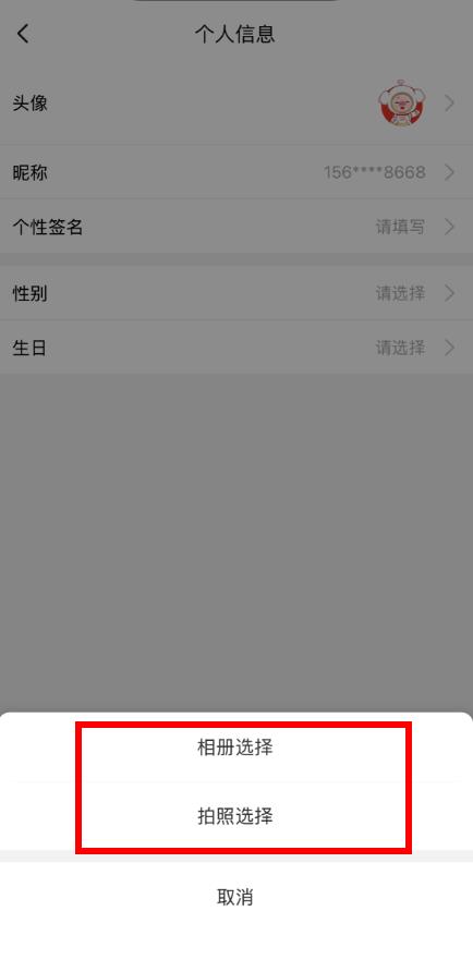 4、在弹出的选项中,选择相册选择从手机相册选取图片,或选择拍照选择即时拍摄照片作为新头像,完成头像修改。