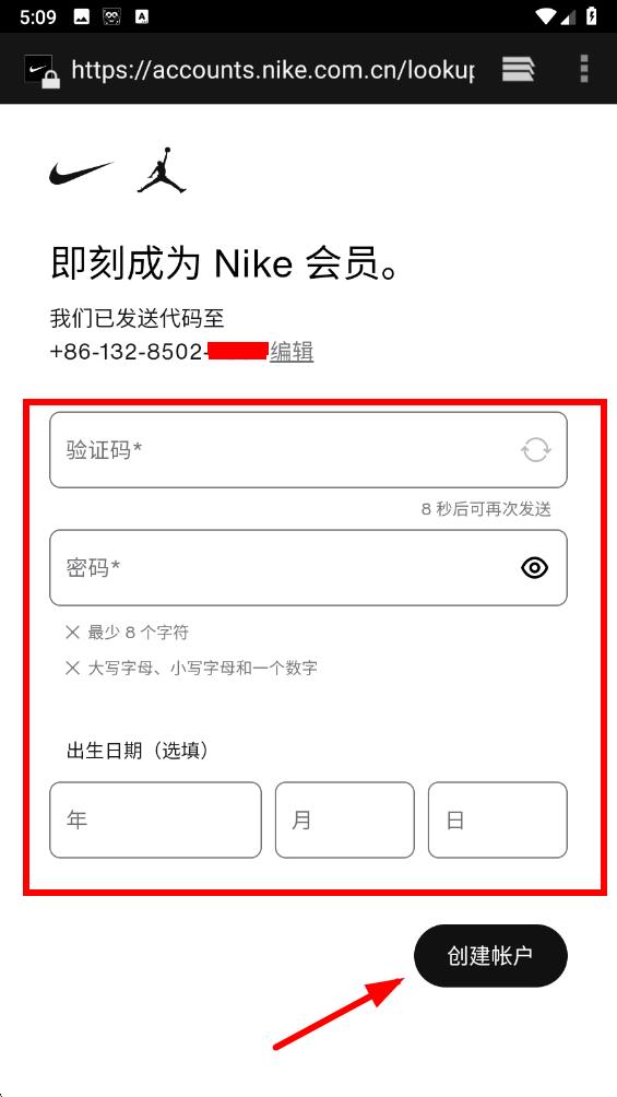 3、系统会发送验证码到您输入的手机号,在验证码输入框填写收到的验证码,设置满足要求的密码,选填出生日期,完成后点击创建帐户,即可完成耐克app账号注册。