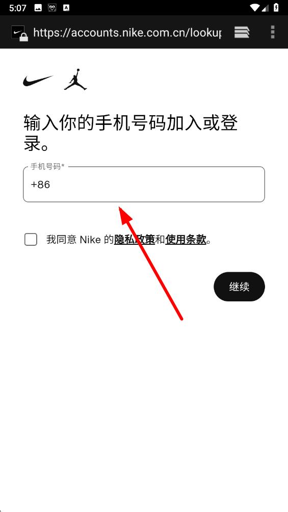 2、在跳转的页面中,在手机号码输入框内,输入您的手机号码,并勾选同意Nike的隐私政策和使用条款,然后点击继续。