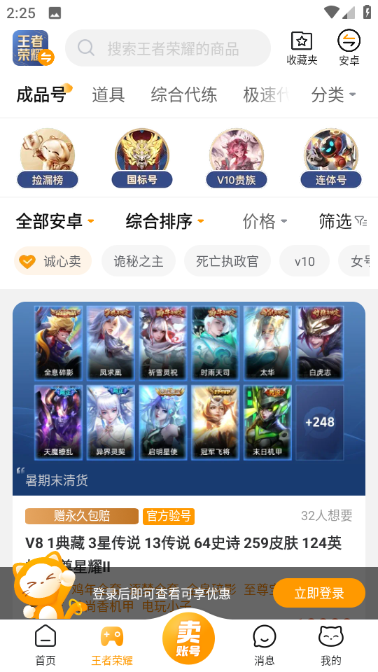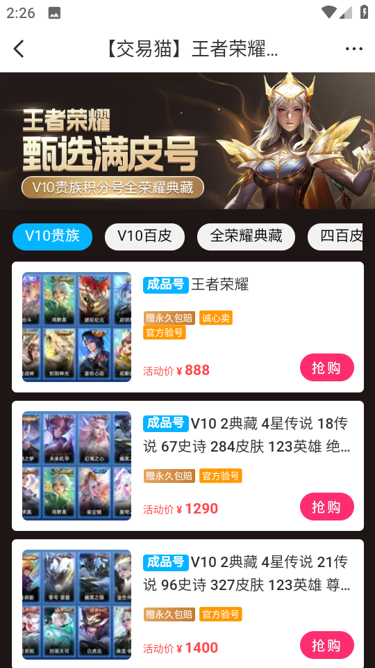 1、在交易首页,浏览找到心仪的王者荣耀账号,点击进入该账号列表页面。
