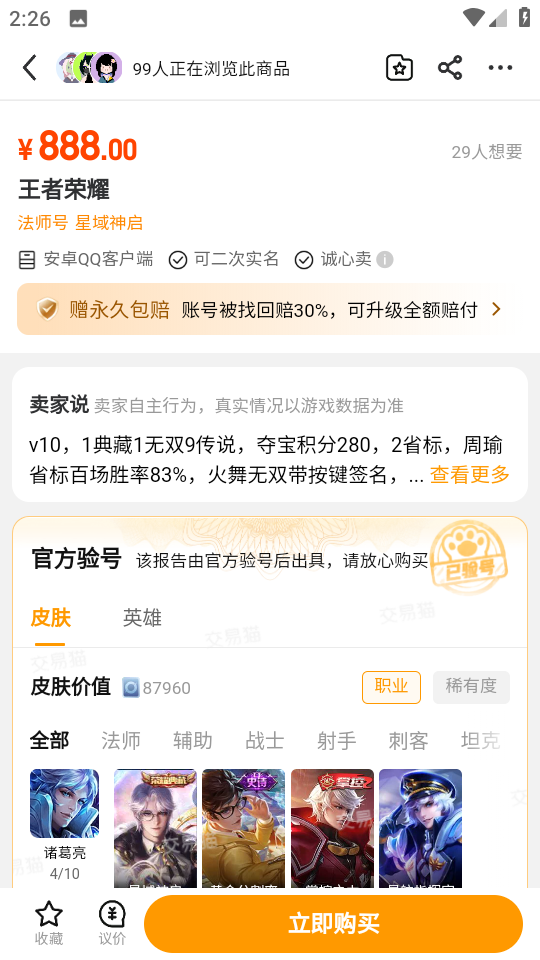 2、在账号列表页面,选择价格为888元的账号,进入该账号详情页面。