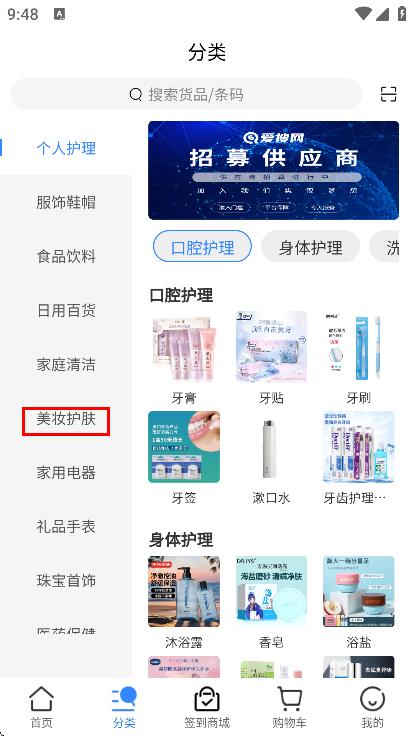 2、在分类页面左侧栏,找到并点击美妆护肤分类。