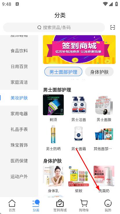 3、进入美妆护肤分类后,点击进去可看到洗面奶商品。