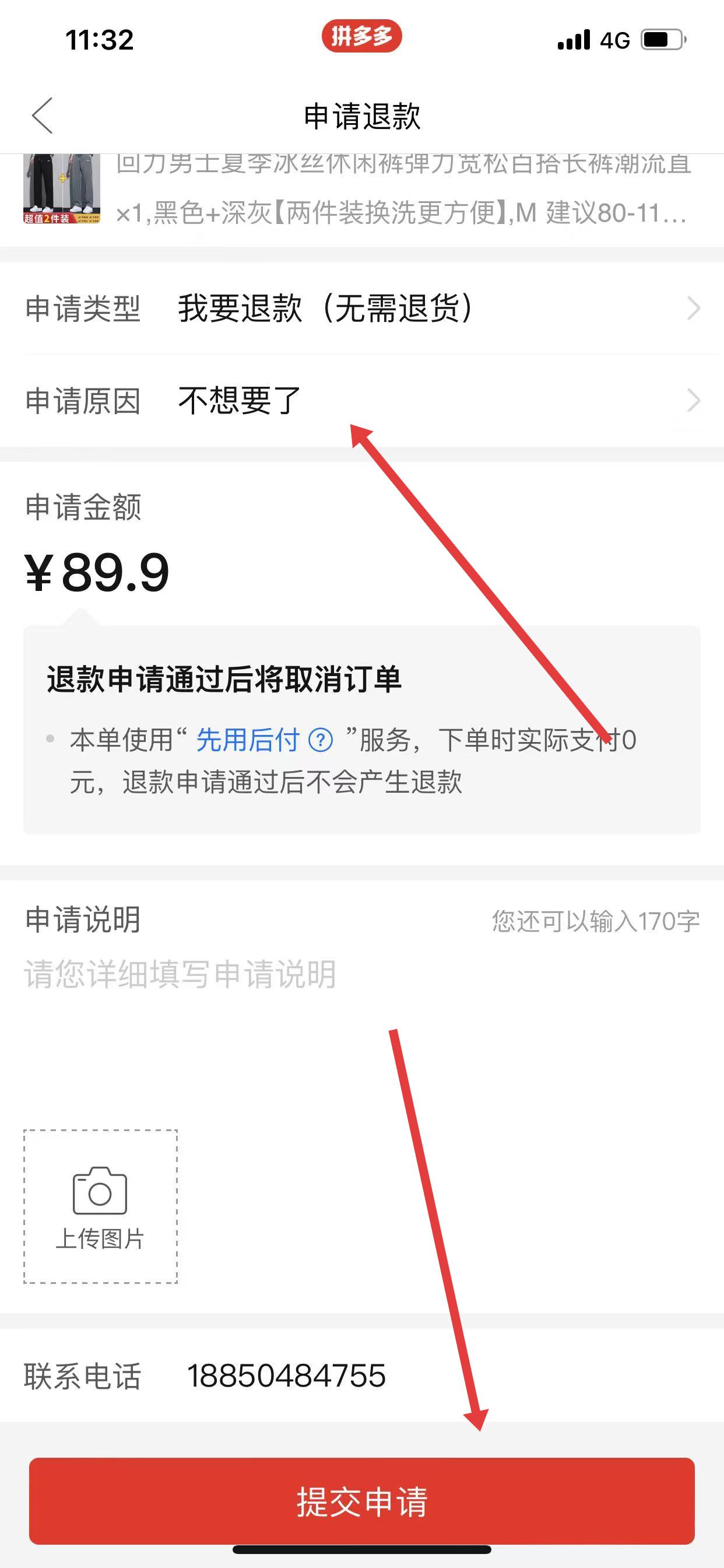 3、进入申请售后页面后,选择我要退款、无需退货的申请类型,填写取消订单的原因,点击提交申请,等待商家处理退款。