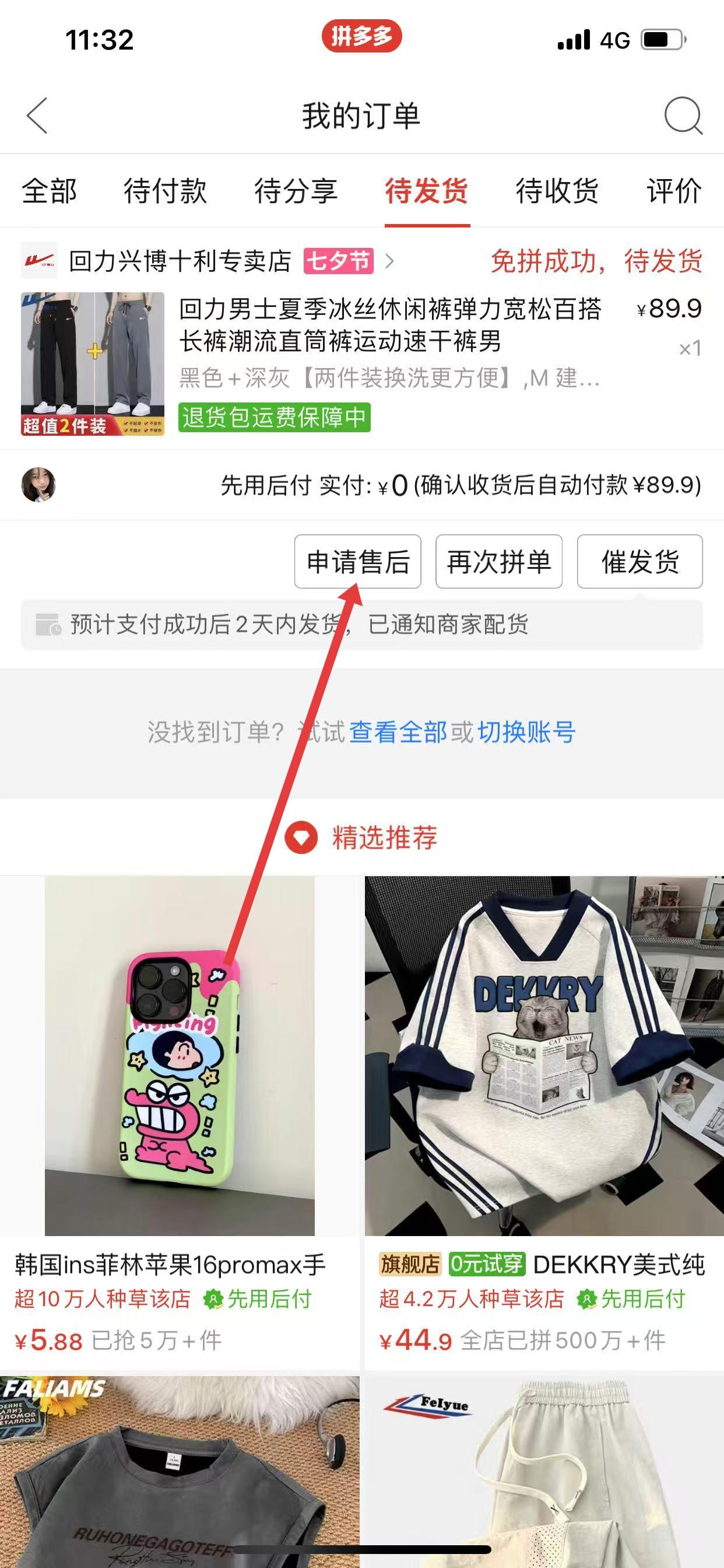 2、在待发货订单列表中,找到想要取消的订单,点击该订单进入订单详情页面,在订单详情页面,点击申请售后按钮。