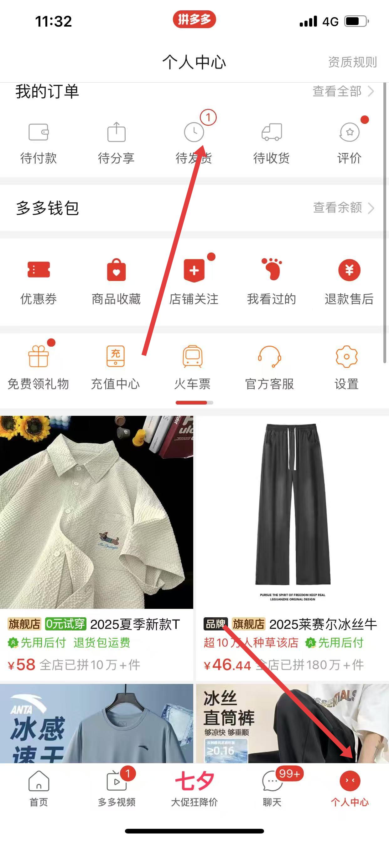 1、打开拼多多APP,点击底部导航栏中的个人中心,进入个人中心页面,在我的订单板块,点击待发货选项。