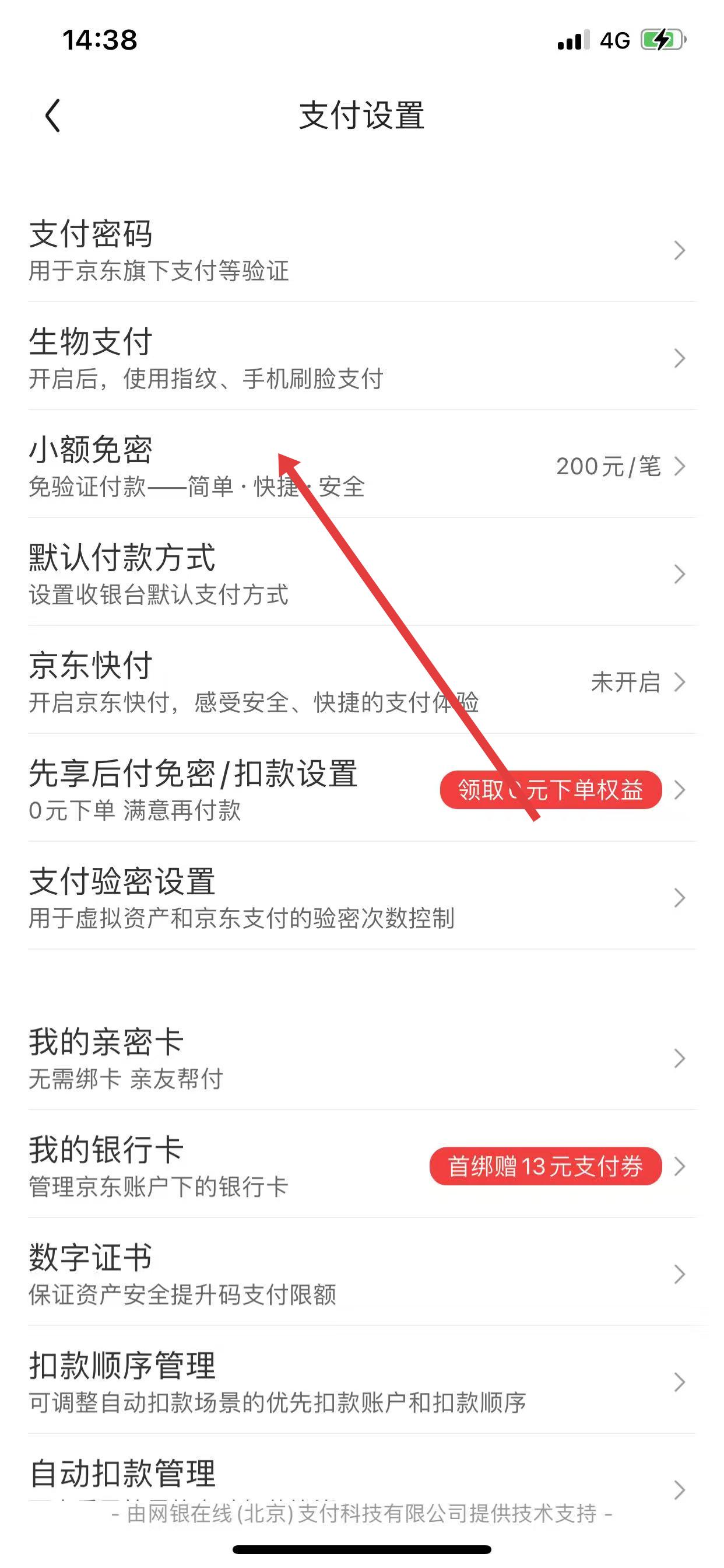 2、进入支付设置页面后,选择小额免密进入。