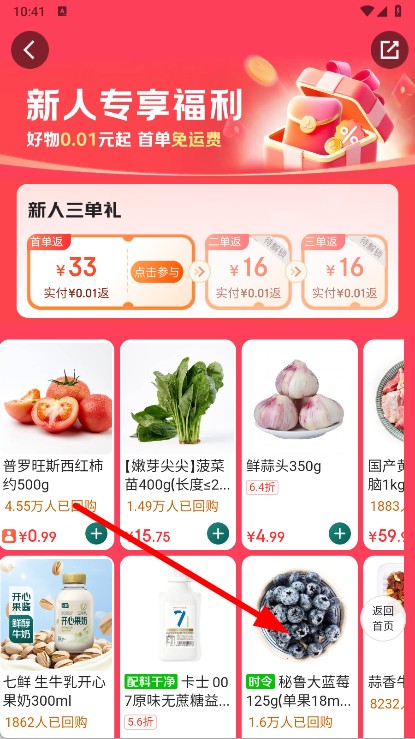 3、在新人专享福利页面,找到秘鲁大蓝莓商品并点击,进入该商品的详情页面。